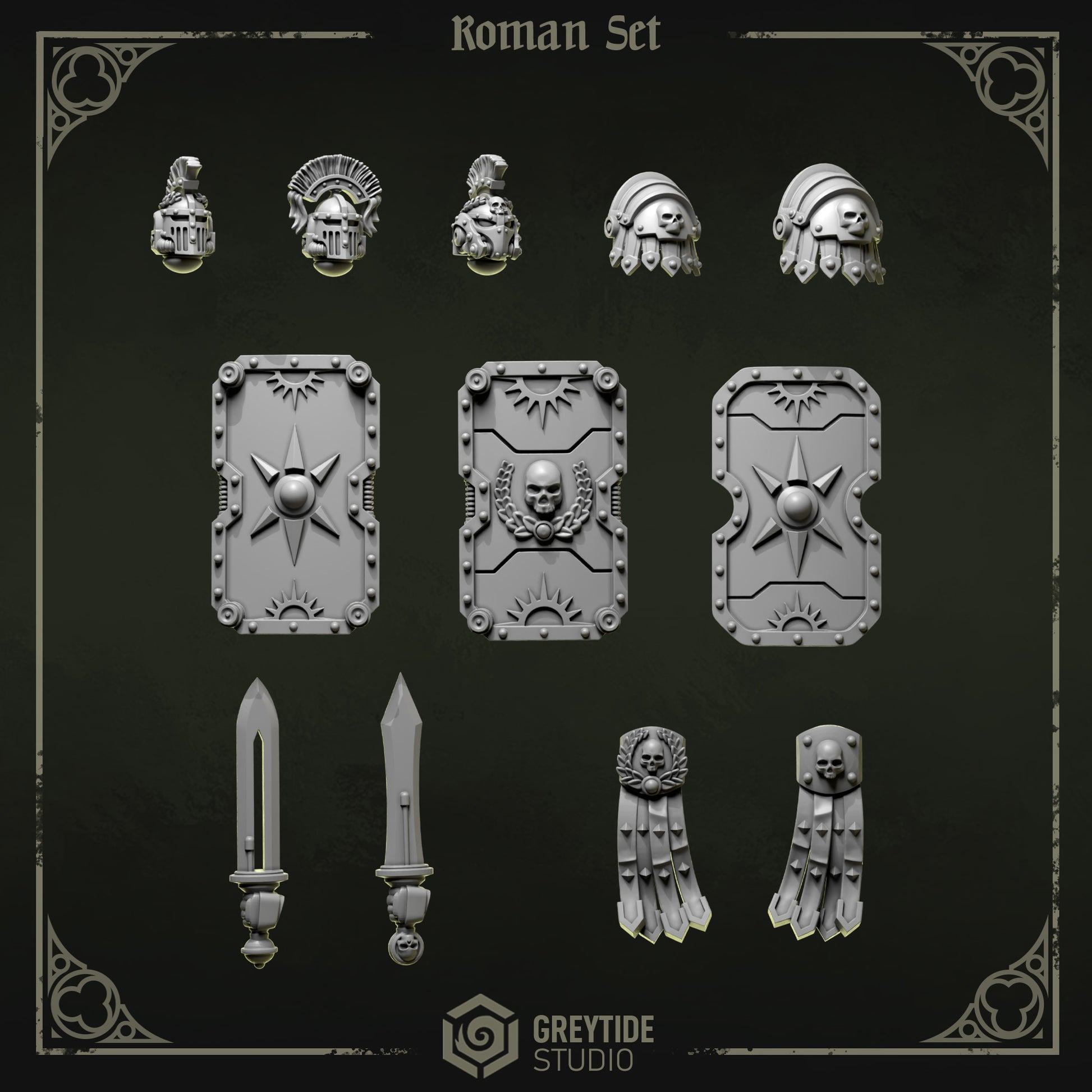 Customize and equip your miniatures with Eternal Pilgrim bits. Contains 3 different heads, 2 shoulder pads, 3 Roman Tower Shield, 2 swords, and 2 loincloth bits printed in 3D printer resin.
